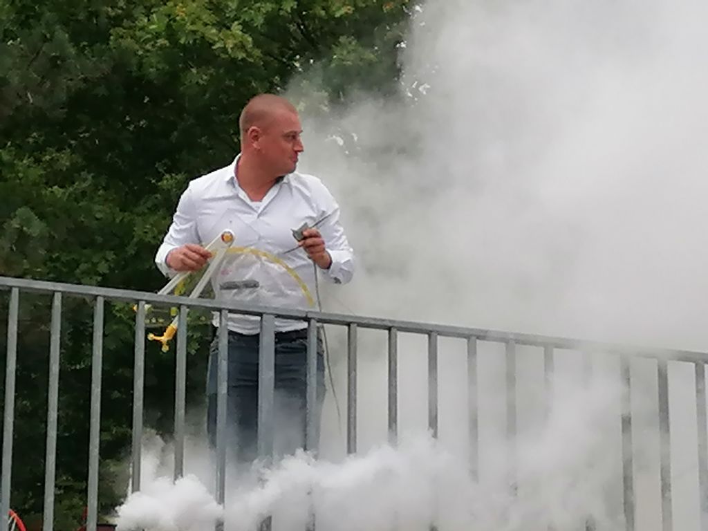Gerade fertig mit dem Tanzen und noch die meisten Gäste im Schulhof anwesend qualmte es plötzlich und man hörte schon die Feuerwehrsirene! „Hurra die Schule brennt“ … eine Schauübung der Jugendfeuerwehr wurde spektakulär in Szene gesetzt, der Schulleiter Johannes Dirnberger wurde „gerettet“.