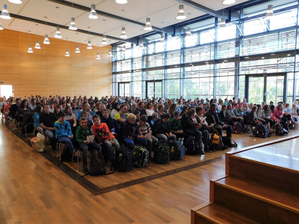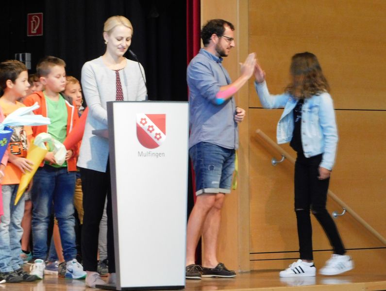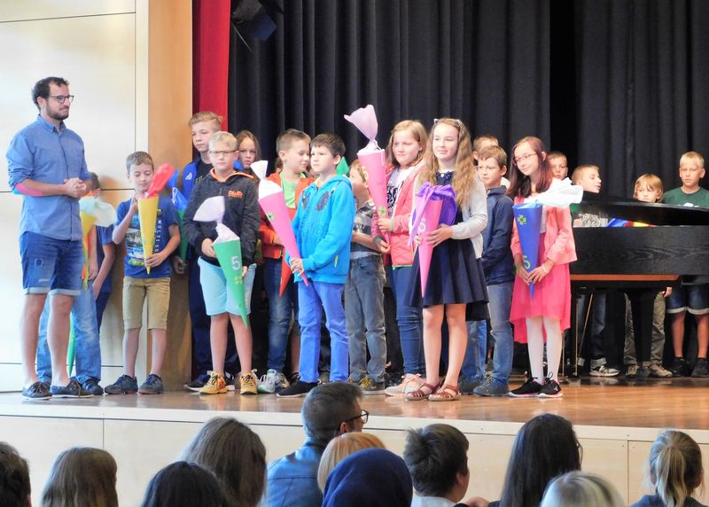 Es folgte durch Frau Orth die Einteilung in die verschiedenen Klassen und die Zuteilung der Paten. Der Klassenlehrer der 5a, Herr Stier, begrüßte jeden Schüler per Handschlag und auch Frau Schmitt, Klassenlehrerin der 5b, begrüßte ihre neuen Schüler persönlich. Die Paten überreichten „ihrem“ Fünftklässler eine selbst gebastelte Schultüte mit nützlichem Inhalt wie Stiften und Post-Its.