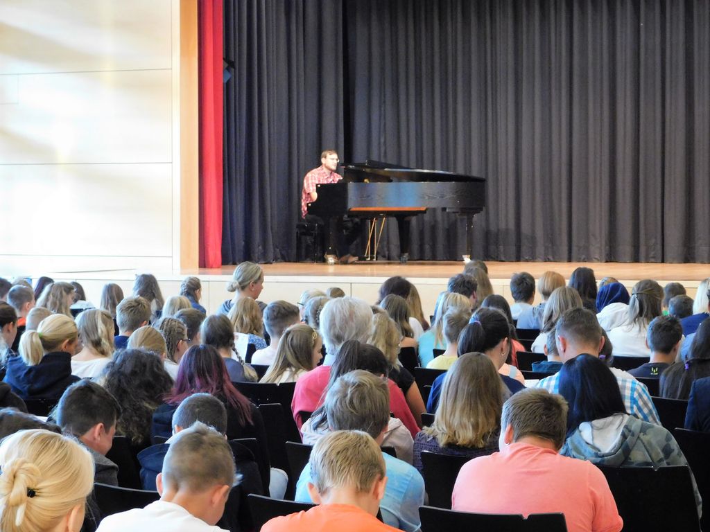 Passend dazu begleitete der Musiklehrer Herr Bystricky das durch die Schulgemeinschaft gesungene Lied „Ins Wasser fällt ein Stein“ auf dem Klavier.